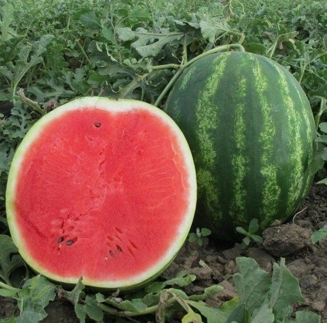 Плод: Правильной округлой формы, массой – 7-8 кг. Кора плотная, зеленая, с ярко выраженным восковым налетом, полосы средней ширины темно-зеленые. Мякоть плотная, хрустящая, темно-красная, очень сладкая;